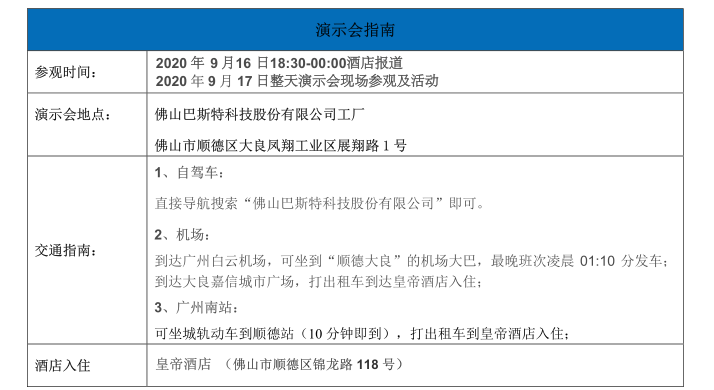 活動地址:廣東省佛山市順德區(qū)大良鳳翔工業(yè)區(qū)展翔路1號佛山巴斯特科技股份有限公司