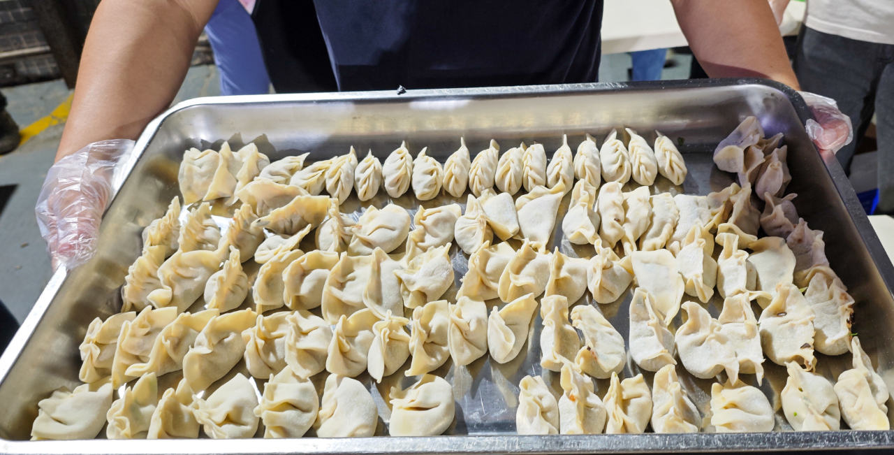 廚房團隊已經(jīng)準備好香氣四溢的餃子餡和餃子皮,方便大家專注于享受包餃子競賽帶來的樂趣。全體員工分成七組圍坐成圈,投入到包餃子的比拼中。有的同事手法熟練,拿起一張餃子皮,舀上一勺餡料,輕輕一捏,一個飽滿的餃子就誕生了;有的員工雖略顯生澀,卻無比認真,在其他同事的耐心指導下,也逐漸掌握了技巧,包出的餃子越來越像模像樣。